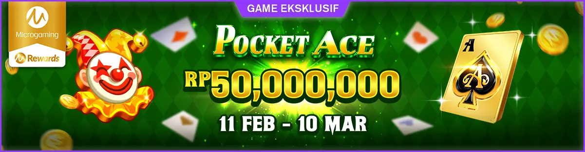 Pocket Ace Tournamen akan berlangsung mulai dari 11 FEB 2026 00:00 WIB hingga 10 MAR 2026 23:59 WIB. Total 4 turnamen dengan total jumlah hadiah Rp 50,000,000 yang akan dibagikan kepada 1200 pemain yang memiliki skor tertinggi di papan peringkat.